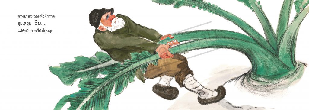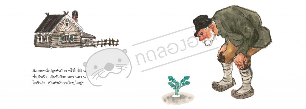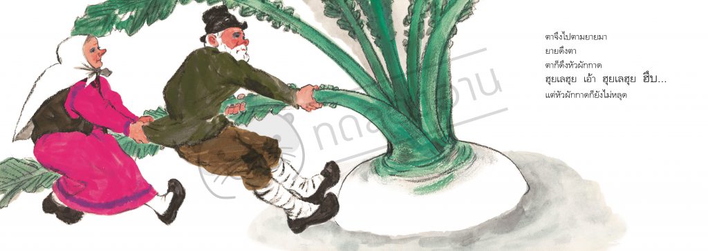 และเพื่อให้น้องสนุกมากยิ่งขึ้นคุณแม่ควรอ่านเรื่องไปตามตัวอักษรและออกเสียงให้ชัดเจน พร้อมทั้งให้เวลาน้องได้สังเกตภาพตัวละครในแต่ละหน้า ชวนสังเกตด้วยการตั้งคำถาม ชวนให้ดู และคาดเดา เช่น น้องๆ จะช่วยคุณตาดึงหัวผักกาดยักษ์ขึ้นมาได้อย่างไร
