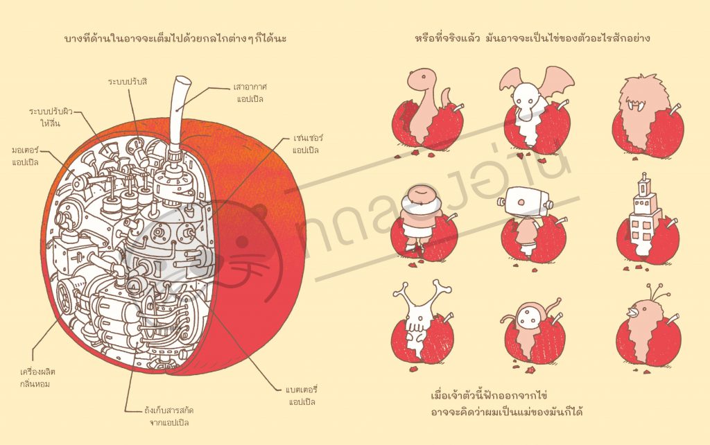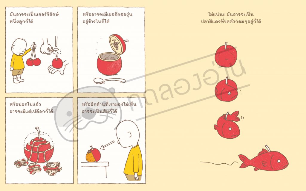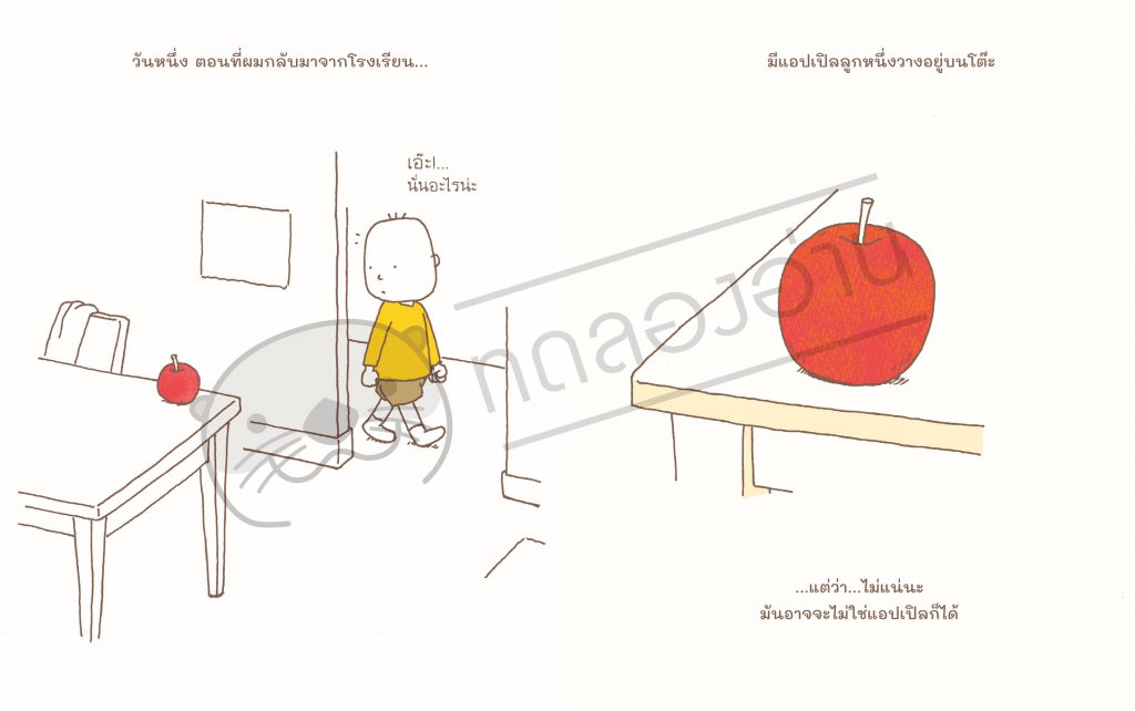 เนื้อเรื่องเริ่มต้นจากมีแอปเปิลลูกหนึ่งวางอยู่บนโต๊ะ เด็กน้อยมาเห็นเข้าก็คิดว่ามันอาจจะไม่ใช่แอปเปิลก็ได้นะ จากนั้นน้องๆ ก็จะได้โลดแล่นอยู่ในจินตนาการอันแสนสนุก และความคิดสร้างสรรค์ของเขา อย่างเช่น อาจจะเป็นปลาสีแดงที่ขดตัวอยู่ อาจจะเป็นไข่ของตัวอะไรซักอย่าง หรืออาจจะมีพี่น้องมากมาย แล้วรอเวลารวมพล กลับบ้านเกิดกันก็ได้ หลังจากพิจารณาอย่างถี่ถ้วนแล้ว เขาก็เริ่มจะหิวแล้วสิ