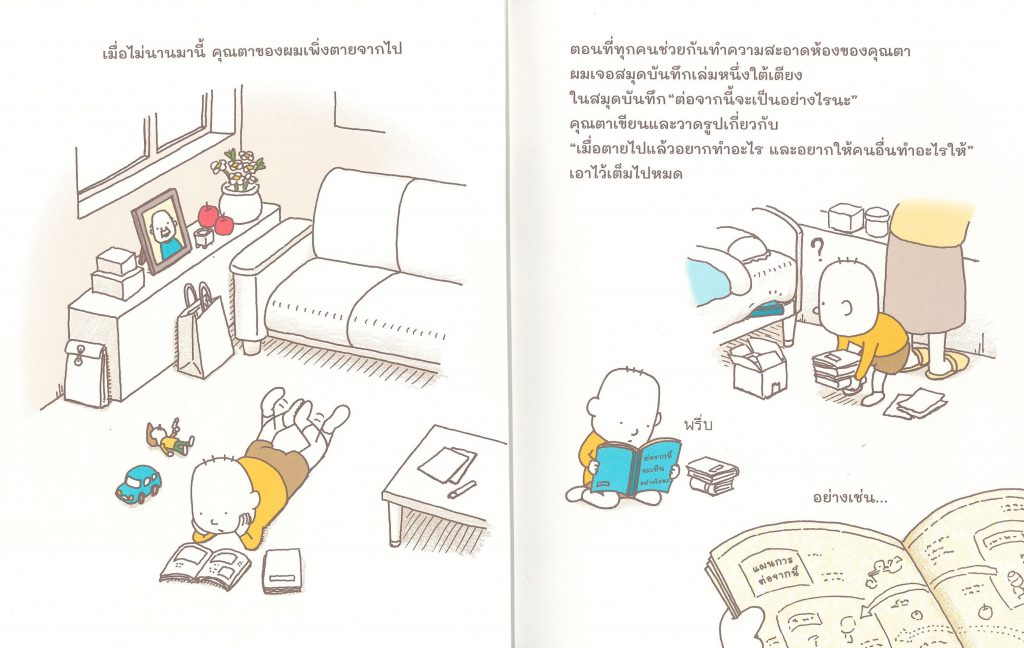 เนื้อเรื่องเริ่มต้นจากคุณตาของเด็กน้อยเพิ่งเสียชีวิตไปไม่นาน ขณะที่ครอบครัวกำลังช่วยกันทำความสะอาดห้องของคุณตาอยู่ เด็กน้อยก็ได้ไปพบกับสมุดบันทึกเล่มหนึ่งที่คุณตาเคยเขียนและวาดรูปไว้ว่าเมื่อตายไปแล้วอยากทำอะไร และอยากให้คนอื่นทำอะไรให้ น้องๆ จะได้เรียนรู้ทักษะการวางแผน การเตรียมตัวหลังความตายแบบสนุกๆ ที่คุณตาคิดเอาไว้ สุดท้ายเด็กน้อยก็คิดได้ว่า ถ้าจะมีสมุดบันทึกอีกสักเล่ม ตอนนี้จะทำอะไรดีนะ ก็ดีเหมือนกันนะ