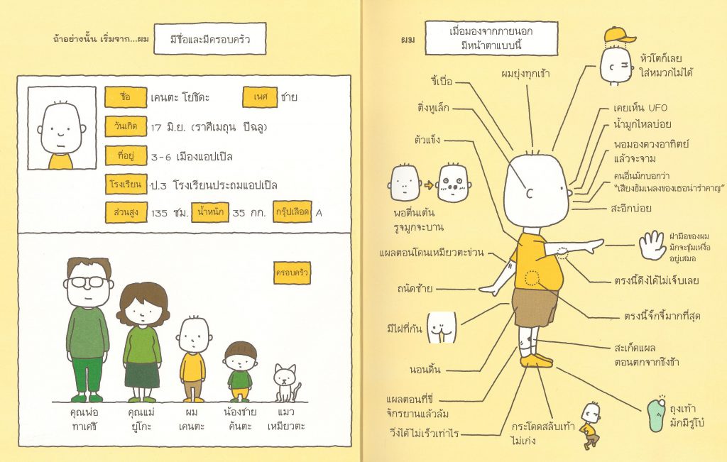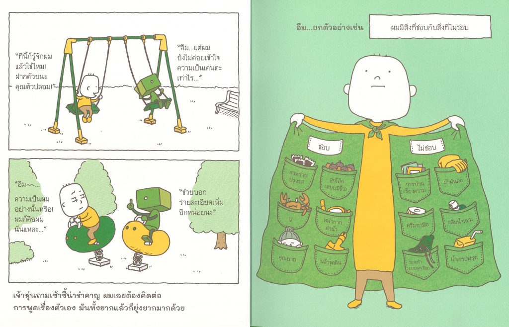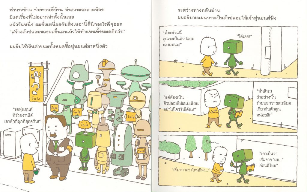 นิทานเรื่องนี้เริ่มต้นขึ้นจาก เคนตะ เด็กชายผู้ซึ่งไม่อยากทำการบ้าน และ งานบ้าน ต้องการหาหุ่นยนต์ตัวปลอมซักตัวมาทำงานที่น่าเบื่อเหล่านี้แทน ความสนุกจึงได้เริ่มขึ้นเมื่อ เคนตะ ต้องพยายามอธิบายว่าเขาเป็นใคร มีลักษณะอย่างไร ให้กับหุ่นยนต์ที่เพิ่งซื้อมา อย่างเช่น เขาเป็นลูกของคุณพ่อกับคุณแม่ เป็นเครื่องผลิตอึ เป็นเครื่องทำถุงเท้าพัง เขาสามารถอยู่ได้หลายที่ซึ่งบทบาทก็จะแตกต่างกันไป ภาพน่ารักและเนื้อเรื่องสนุกสนานอ่านไปอมยิ้มไป สุดท้ายเขาก็ได้เรียนรู้ว่าทุกคนแตกต่าง และมีตัวตนของตนเองเหมือนเป็นต้นไม้คนละต้น แต่ส่ิงสำคัญที่สุดคือเราชอบต้นไม้ของเราไหมต่างหาก