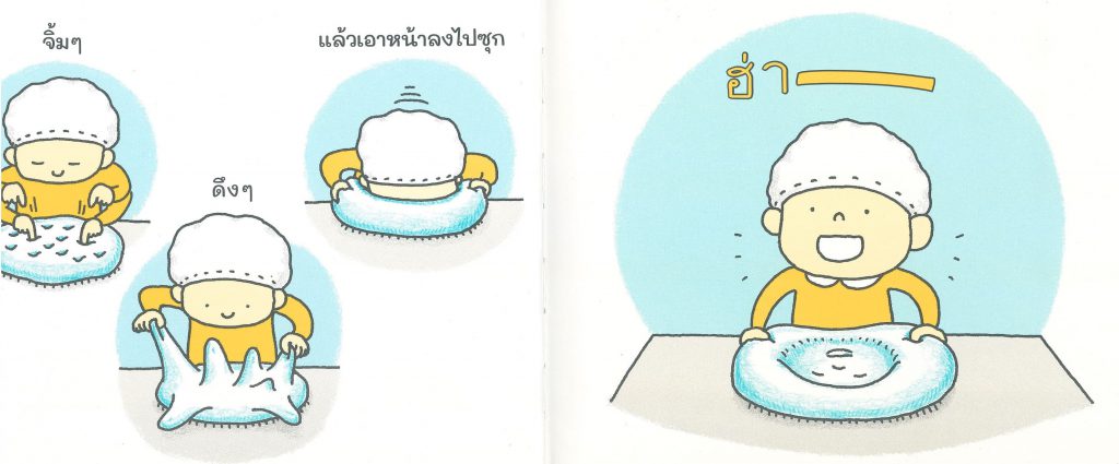 และเพื่อให้น้องสนุกมากยิ่งขึ้นคุณแม่ควรอ่านเรื่องไปตามตัวอักษรและออกเสียงให้ชัดเจน พร้อมทั้งให้เวลาน้องได้สังเกตภาพตัวละครในแต่ละหน้า ชวนสังเกตด้วยการตั้งคำถาม ชวนให้ดู และคาดเดา เช่น น้องๆ อยากปั้นแป้งเป็นรูปอะไรดีนะ
