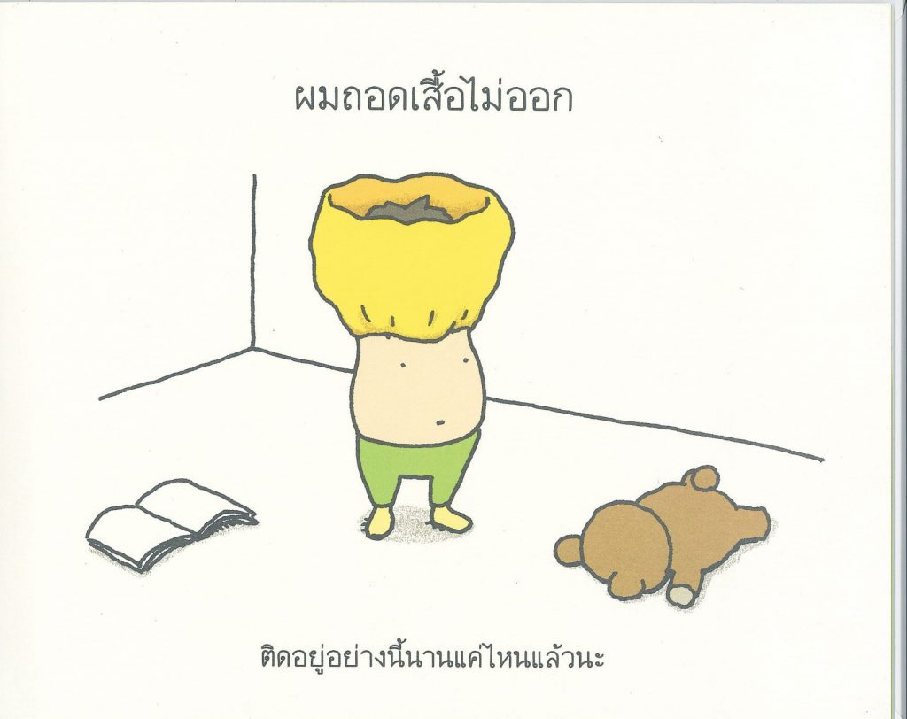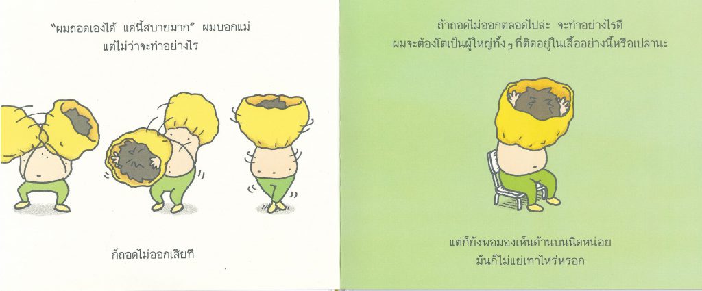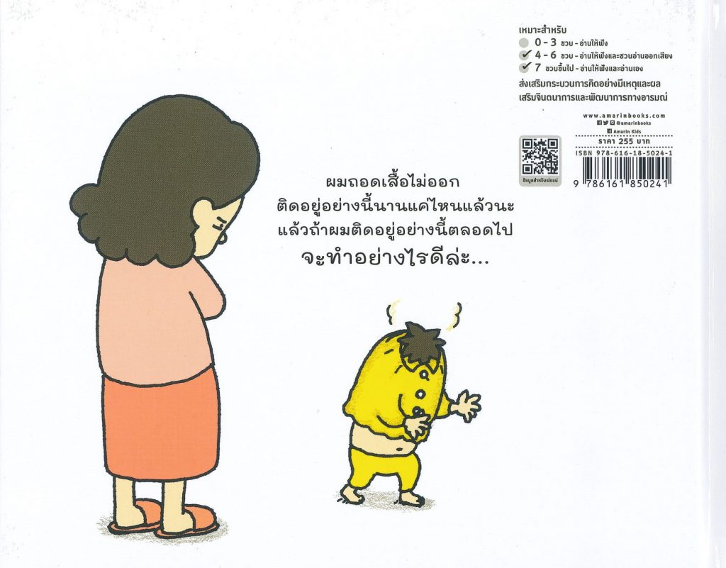 เรื่องราวเริ่มต้นจากการที่คุณแม่บอกให้เจ้าหนูไปอาบน้ำ คุณแม่จะถอดเสื้อให้ แต่เจ้าหนูบอกว่าเขาสามารถทำเองได้ และพยายามถอดเสื้อด้วยตัวเองแต่ผลลัพธ์ก็ไม่เป็นอย่างที่หวัง เพราะเสื้อติดอยู่ที่หัวของเขา ความสนุกต่อจากนั้นเป็นการจินตนาการการใช้ชีวิตแบบที่มีเสื้อติดอยู่ที่หัวตลอดเวลา จนเขากลับมาคิดว่าควรจะขอความช่วยเหลือจากคุณแม่ดีมั๊ย หรือพยายามต่อไปเองดี สุดท้ายแล้วคุณแม่ก็เข้ามาช่วยแก้ปัญหาได้ แต่ทว่าความท้าท้ายใหม่ๆ กำลังจะเริ่มต้นขึ้นอีกแล้ว