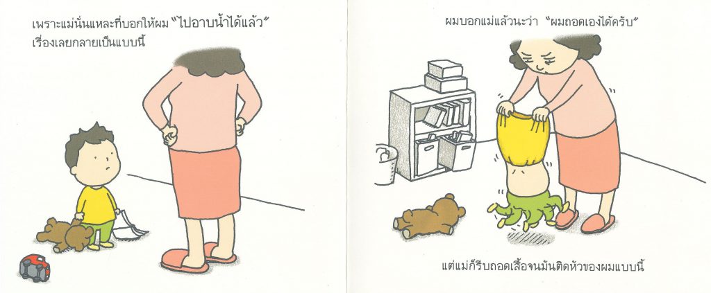 และเพื่อให้น้องสนุกมากยิ่งขึ้นคุณแม่ควรอ่านเรื่องไปตามตัวอักษรและออกเสียงให้ชัดเจน พร้อมทั้งให้เวลาน้องได้สังเกตภาพตัวละครในแต่ละหน้า ชวนสังเกตด้วยการตั้งคำถาม ชวนให้ดู และคาดเดา เช่น ถ้าเสื้อติดแบบเจ้าหนูในเรื่อง น้องๆ จะทำอย่างไร