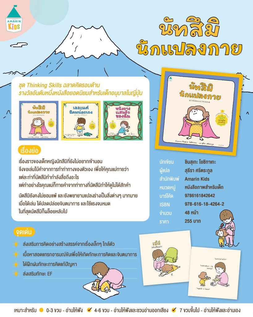 ถ้าคุณแม่อยากสอนลูกให้มีจินตนาการกว้างไกลแนะนำหนังสือเล่มนี้เลยค่ะ “นัทสึมินักแปลงกาย” นิทาน EF เรื่องนี้จะกล่าวถึงหนูน้อยนัทสึมิที่เล่นเกมก่อนนอนกับคุณแม่โดยใช้สิ่งของรอบตัวที่อยู่ในบ้านมาแปลงกายตัวเองแล้วให้คุณแม่ทายว่าคืออะไร