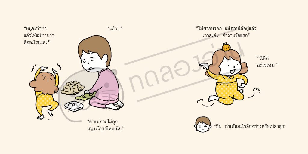และเพื่อให้น้องสนุกมากยิ่งขึ้นคุณแม่ควรอ่านเรื่องไปตามตัวอักษรและออกเสียงให้ชัดเจน พร้อมทั้งให้เวลาน้องได้สังเกตภาพตัวละครในแต่ละหน้า คอยตั้งคำถามเพื่อให้น้องได้แสดงความคิดเห็นและชวนมาทำท่าทางต่างๆให้คุณแม่ทายดูว่าคืออะไร