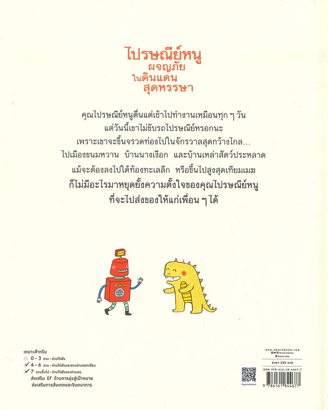 นิทาน EF ที่ส่งเสริมด้านการมุ่งสู่เป้าหมาย ส่งเสริมการสังเกตและจินตนาการ ต้องเล่มนี้เลยค่ะ “ไปรษณีย์หนูผจญภัยในดินแดนสุดหรรษา” นิทานเล่มใหญ่ ที่อัดแน่นไปด้วยรายละเอียดในแต่ละสถานที่ที่ไปรษณีย์หนูไป ให้เด็กๆ ได้สังเกตทั่วทั้งหน้า แม้แต่ในรถเข็นของไปรษณีย์หนู ตั้งแต่จุดเริ่มต้นส่งของจนถึงจุดหมายปลายทาง รวมถึงการได้วางแผน การมุ่งสู่เป้าหมาย และการยืดหยุ่นทางความคิดไปกับตัวละครที่อยู่ในเรื่องอีกด้วย