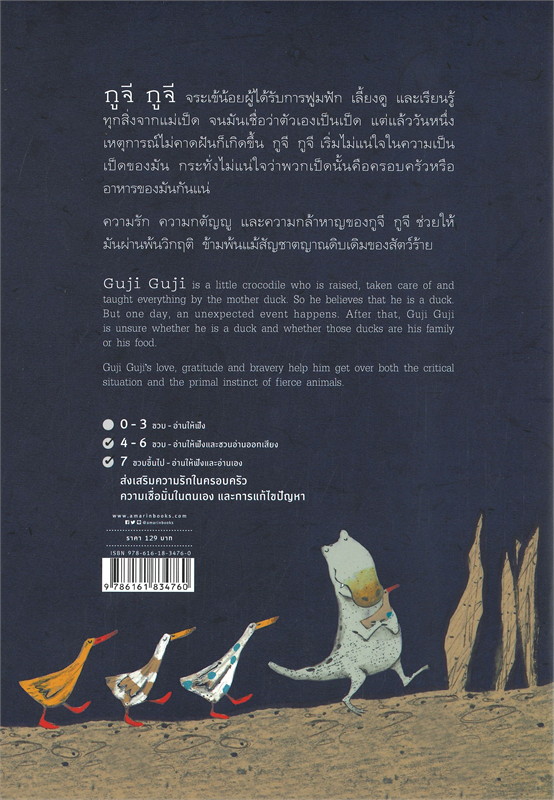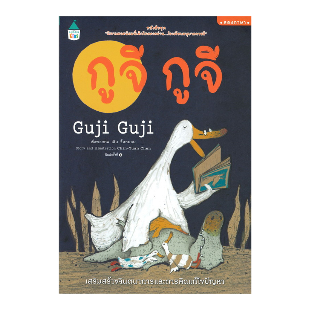 และเพื่อให้น้องสนุกมากยิ่งขึ้นคุณแม่ควรอ่านเรื่องไปตามตัวอักษรและออกเสียงให้ชัดเจน พร้อมทั้งให้เวลาน้องได้สังเกตภาพตัวละครในแต่ละหน้า ชวนสังเกตด้วยการตั้งคำถาม ชวนให้ดู และคาดเดา เช่น ถ้าน้องๆ เป็น กูจี กูจี น้องๆ จะช่วยครอบครัวเป็ดอย่างไร